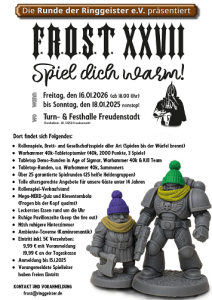 Blog F.R.O.S.T. XXVII – Spiel dich warm! Posted on 22. November 2025Author Ringgeist Es wird kälter und das kann nur ein bedeuten -> F.R.O.S.T. Der nächste F.R.O.S.T. steht unter dem Motto „Spiel dich warm!„ Termin: Freitag 16.01.2026 (ab 18 Uhr) bis Sonntag 18.01.2026