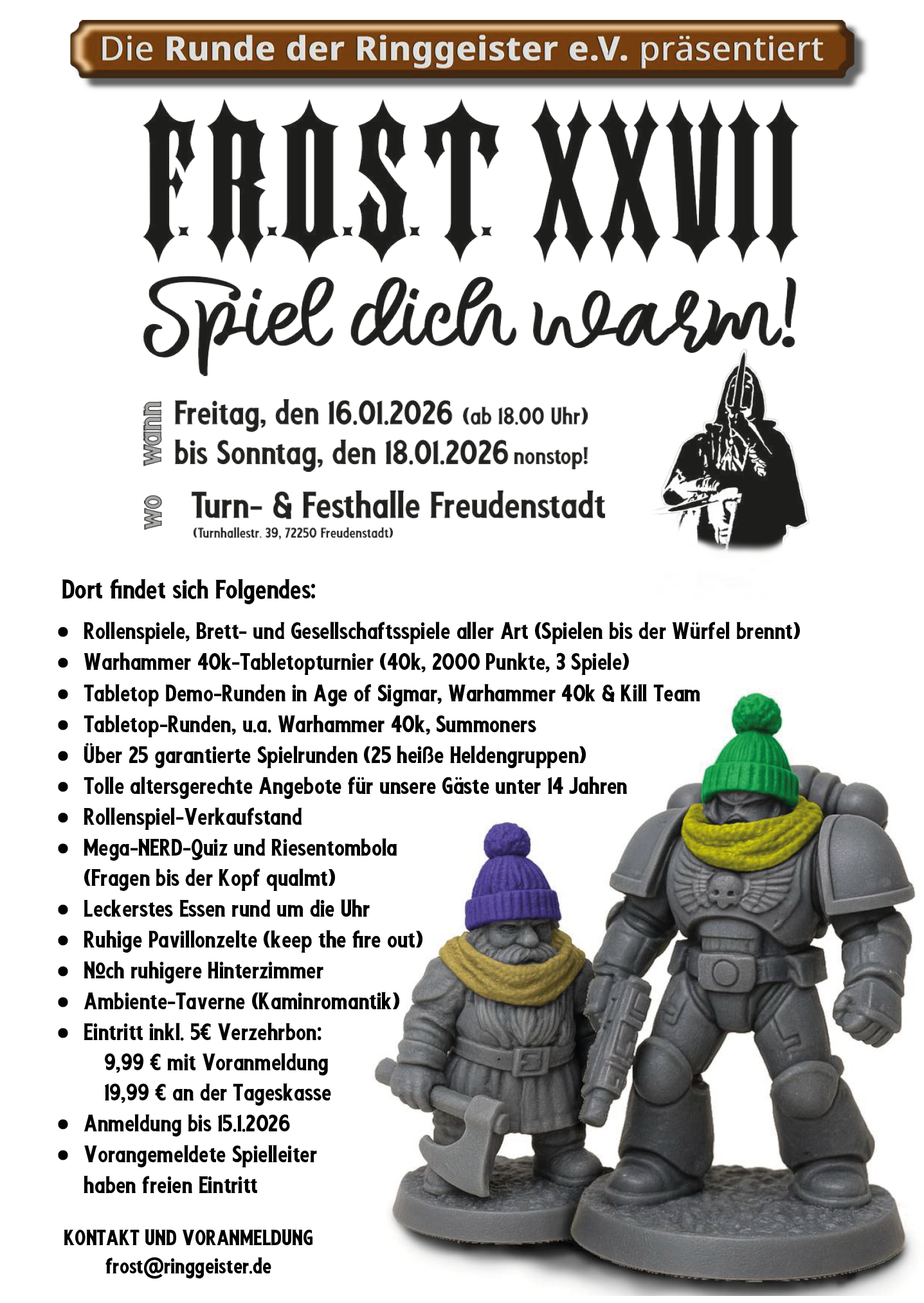 Blog F.R.O.S.T. XXVII – Spiel dich warm! Posted on 22. November 20255. Januar 2026Author Ringgeist Es wird kälter und das kann nur ein bedeuten -> F.R.O.S.T. Der nächste F.R.O.S.T. steht unter dem Motto „Spiel dich warm!„ Termin: Freitag 16.01.2026 (ab 18 Uhr) bis Sonntag 18.01.2026  Â